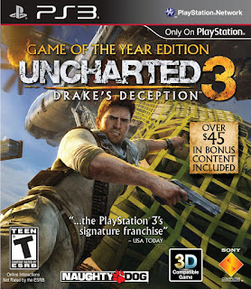 Uncharted 3: Drake's Deception (a decepção de Drake) lançado em 2011, a história começa em Londres onde Nate e Sully vão a um bar ao encontro de Talbot no qual quer comprar o anel usado por Nate, mas a dupla percebe que o dinheiro que lhes foi entregue é falso o que dá início a pancadaria. Ao saírem do bar são surpreendidos pela verdadeira pessoa interessada no anel, Katherine Marlowe que quer usá-lo juntamente com o astrolábio de Sir Francis para encontrar a cidade perdida de Iram dos Pilares (também conhecida como Atlantis das Areias). Após uma breve discussão Nate e Sully são baleados por Charlie Cutter e aí que o jogo volta 20 anos no passado mostrando o jovem Nate em Cartegena, mostrando como ele e Sully se conhecem. A história se foca na obsessão de Nate pelo legado de Sir Francis e no relacionamento com Sully e no realmente é importante. Mais uma vez os gráficos do jogo estão ainda mais impressionantes chegando ao limite do PS3.